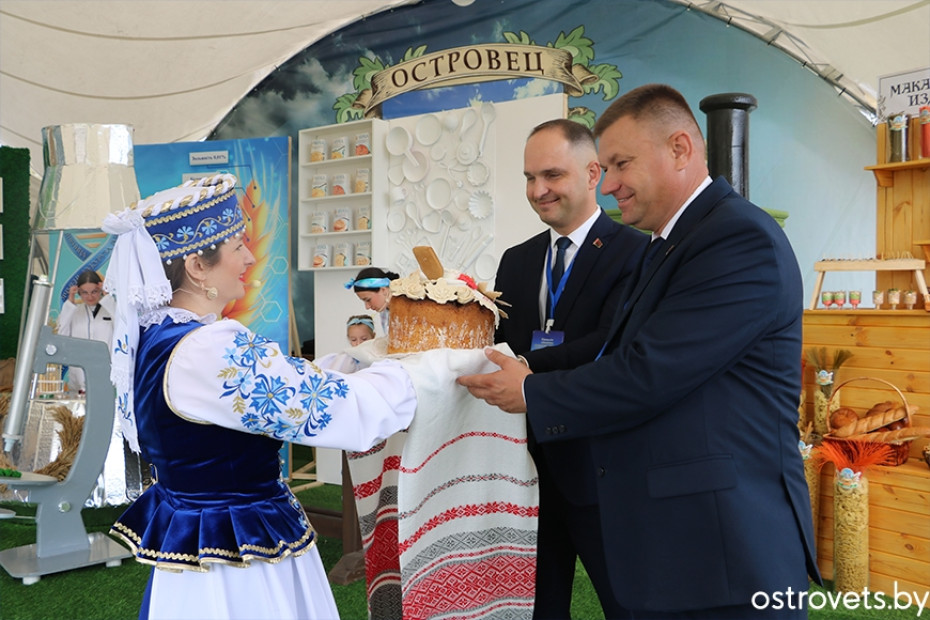 Гасцей прывітаў гаспадар-беларус. Пшаніца, жыта, ячмень, грэчка, авёс – чаго толькі ні вырошчваюць на астравецкіх палях. У адмысловай лабараторыі, дзе ўвагу прысутных прыцягвалі не толькі колбачкі, але і вялізны мікраскоп, дзяўчаты-даследчыцы пільна правяралі зярняты і на “вытворчасць” прапускалі муку толькі вышэйшага гатунку. У сямейнай пякарні дружна мясілі цеста тата, мама і дачушка. А на апошняй лакацыі можна было пабачыць і пакаштаваць усё шматаблічча прадукцыі са збожжа: хлеб, булкі, багеты, пірагі, макароны, піва, квас. Кожнаму з членаў камісіі астраўчане ўручылі памятныя сувеніры, а старшыні Гродзенскага аблвыканкама Юрыю Караеву – холст, на якім адлюстраваны момант наведвання губернатарам нашага раёна падчас жніва.