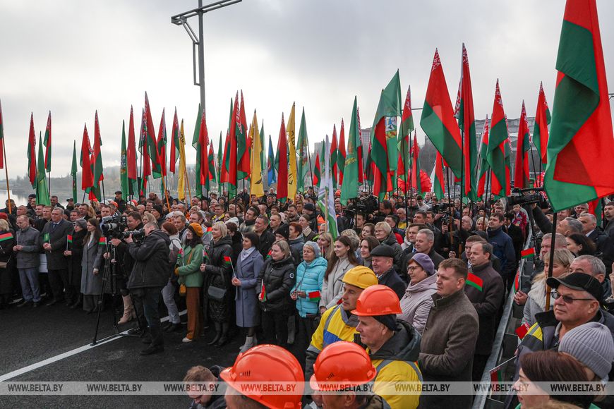 Глава государства в торжественной обстановке перерезал символическую красную ленточку. На церемонию были приглашены представители трудовых коллективов дорожных организаций, участвовавших в строительстве моста, жители Мозырского района. По сложившейся традиции ко Дню Октябрьской революции людям преподносят подарки - значимые, масштабные объекты, и обновленный мост - один из них.