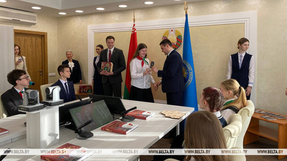 В подарок ребята получили государственный флаг и Конституцию Беларуси, а также книгу "В ритме летящих лет…".