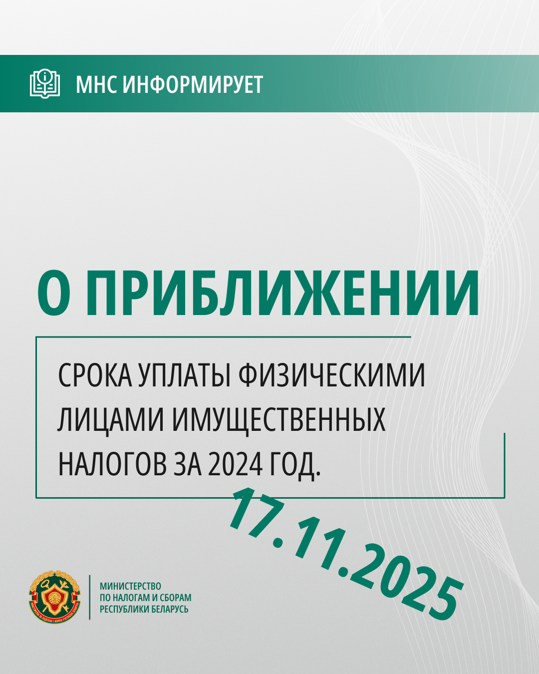 Министерство по налогам и сборам напоминает: 17.11.2025 - последний день уплаты имущественных налогов за 2024 год.